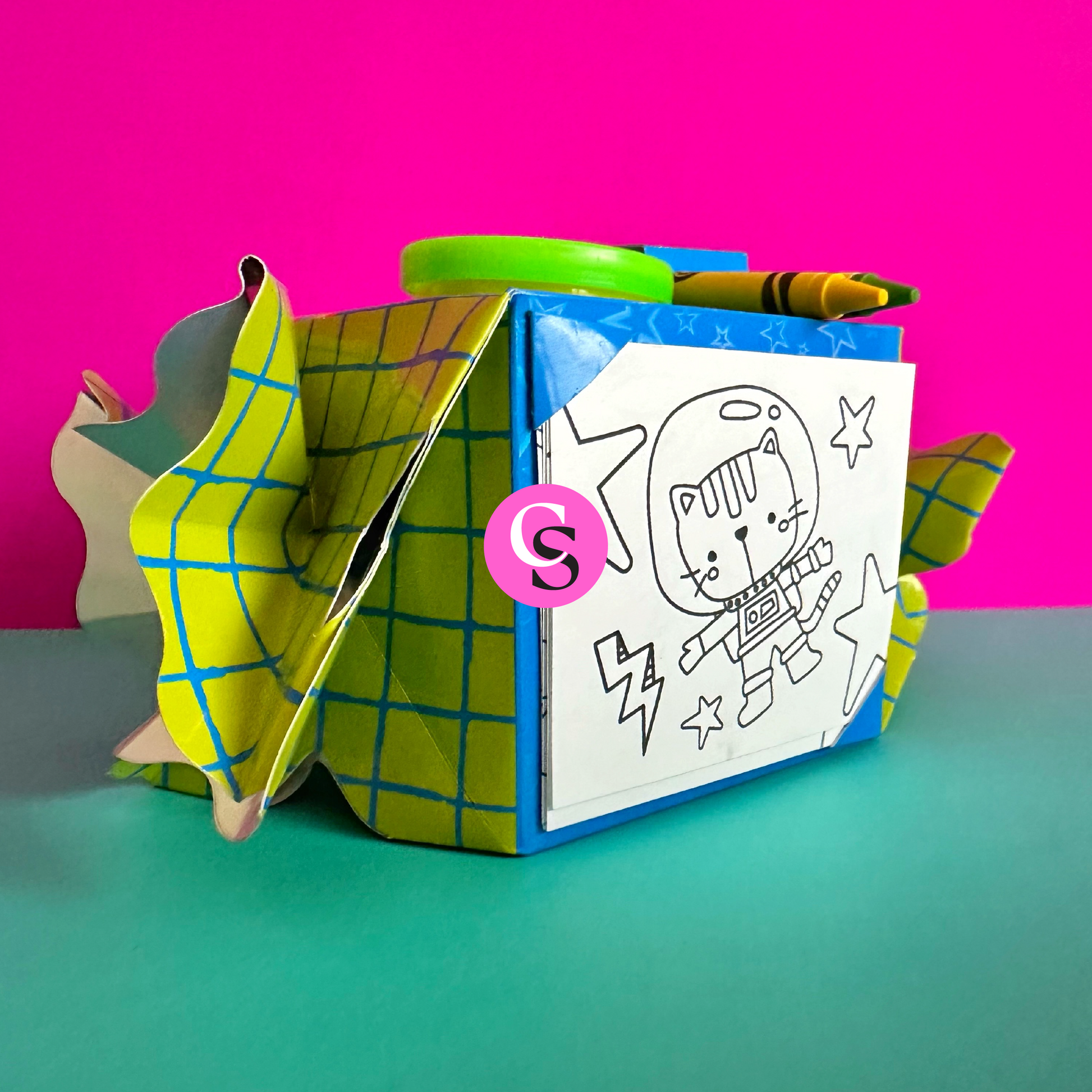 La caja se arma con 2 hojas carta y se necesita 1 adicional para los esquineros de las hojas y el porta crayolas.