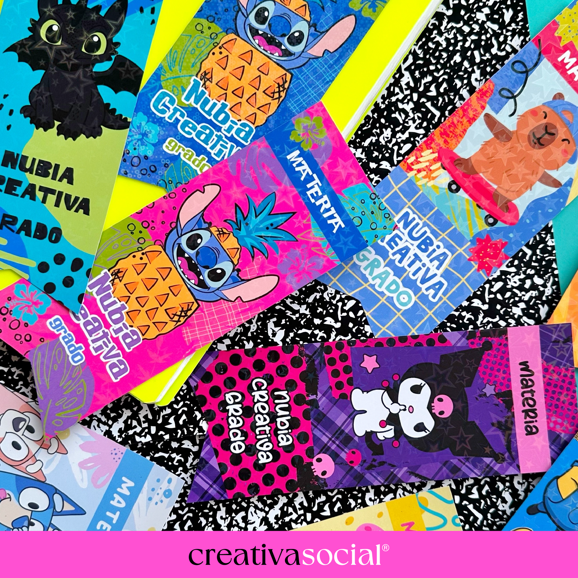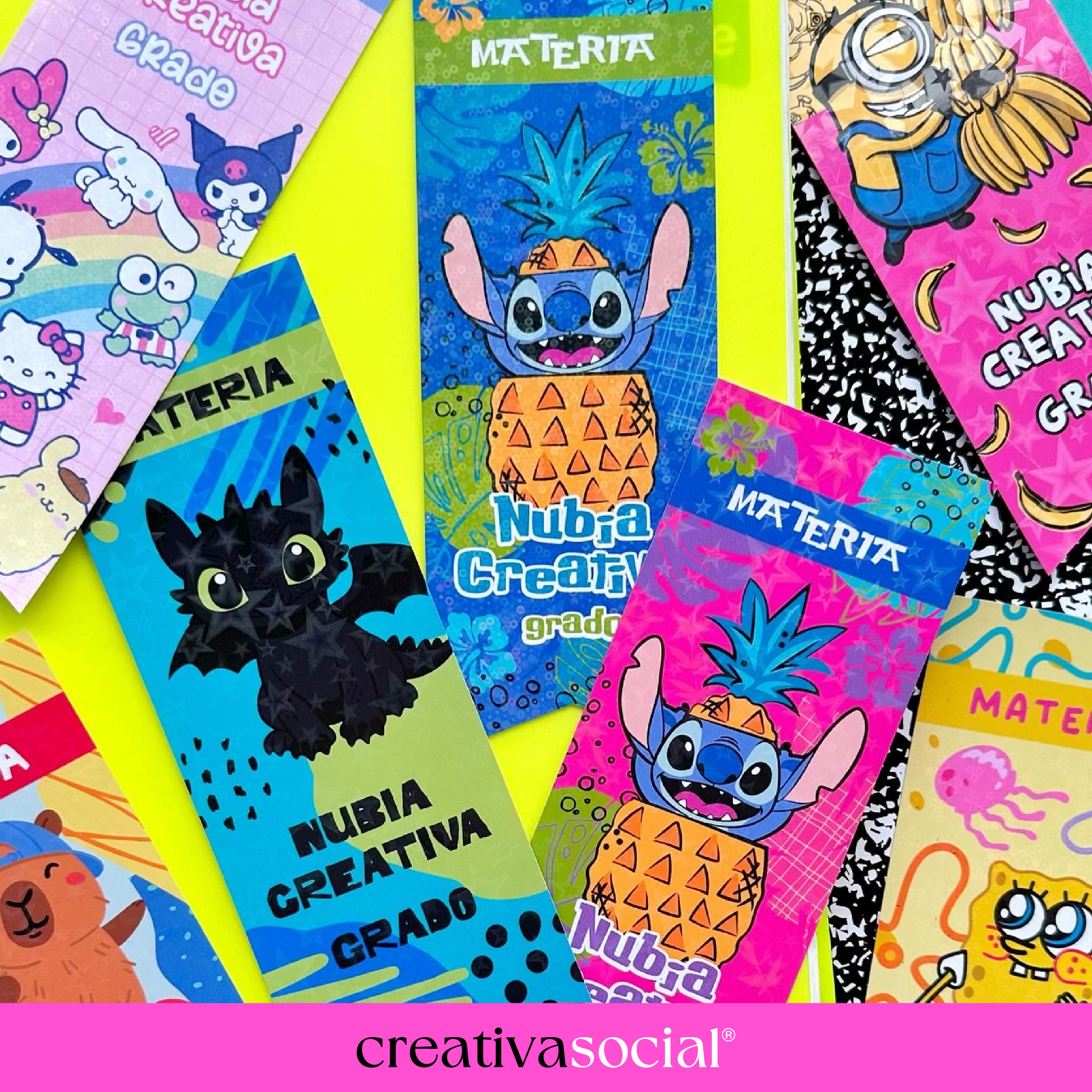 - 6 diseños de niña (7 x 19cm) (stitch, sanrio, kuromi, bluey, minions, bob esponja)