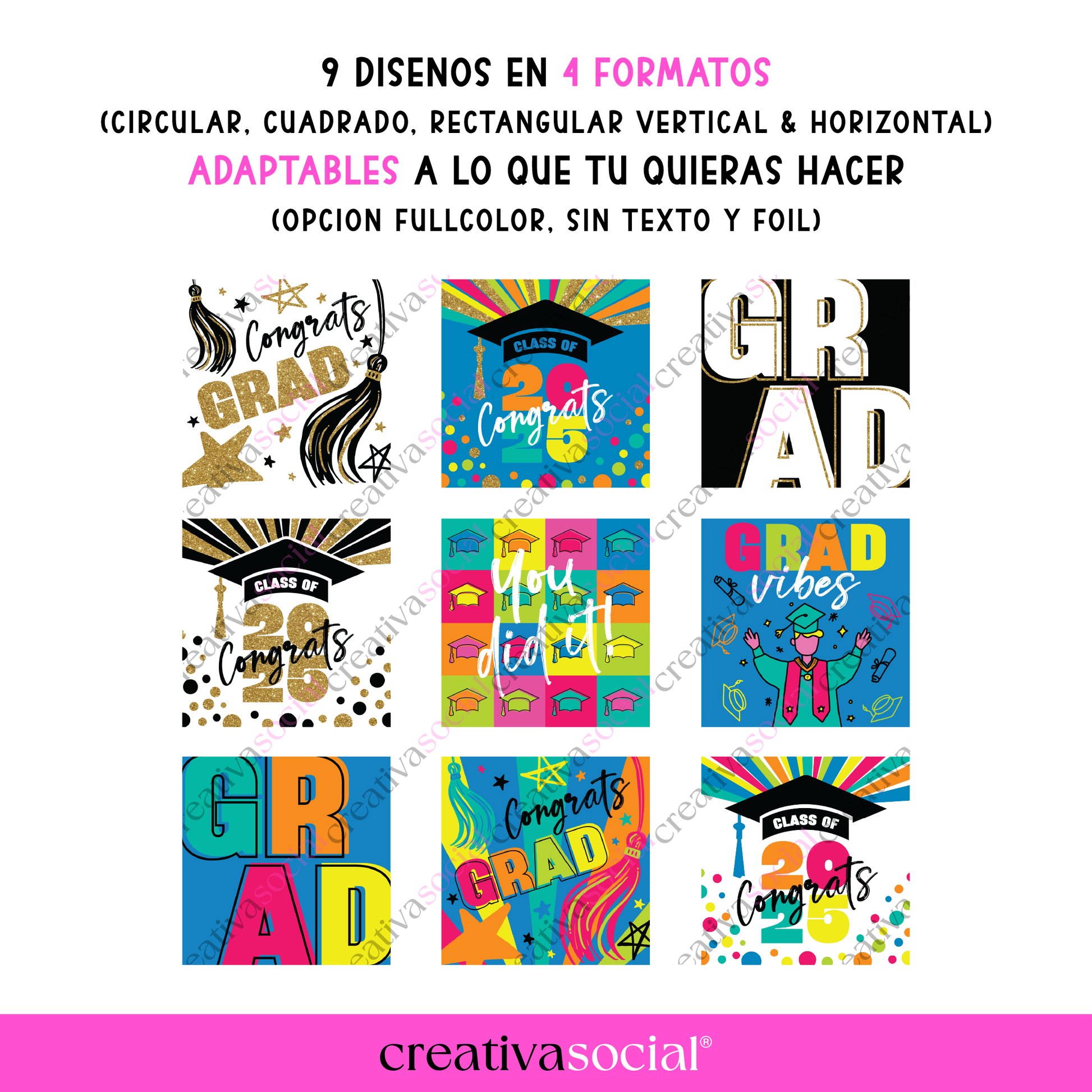 - 9 Diseños en 4 formatos (cuadrado, circular, rectangular horizontal y rectangular vertical) con opción: fullcolor, sin texto y foil