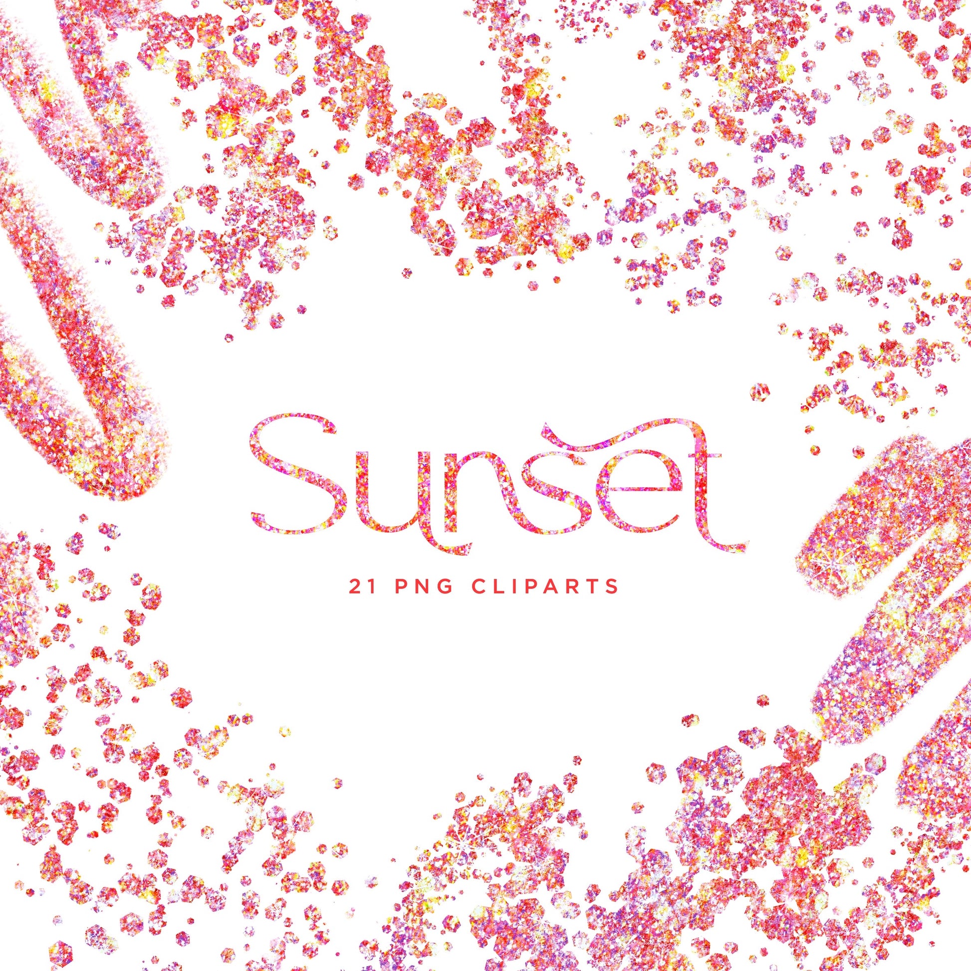 21 elementos PNG en alta resolución de glitter con tonos rosas, amarillos y naranjas que crean una paleta de colores del atardecer que definitivamente resaltará en todos tus diseños agregando el elemento del brillo.